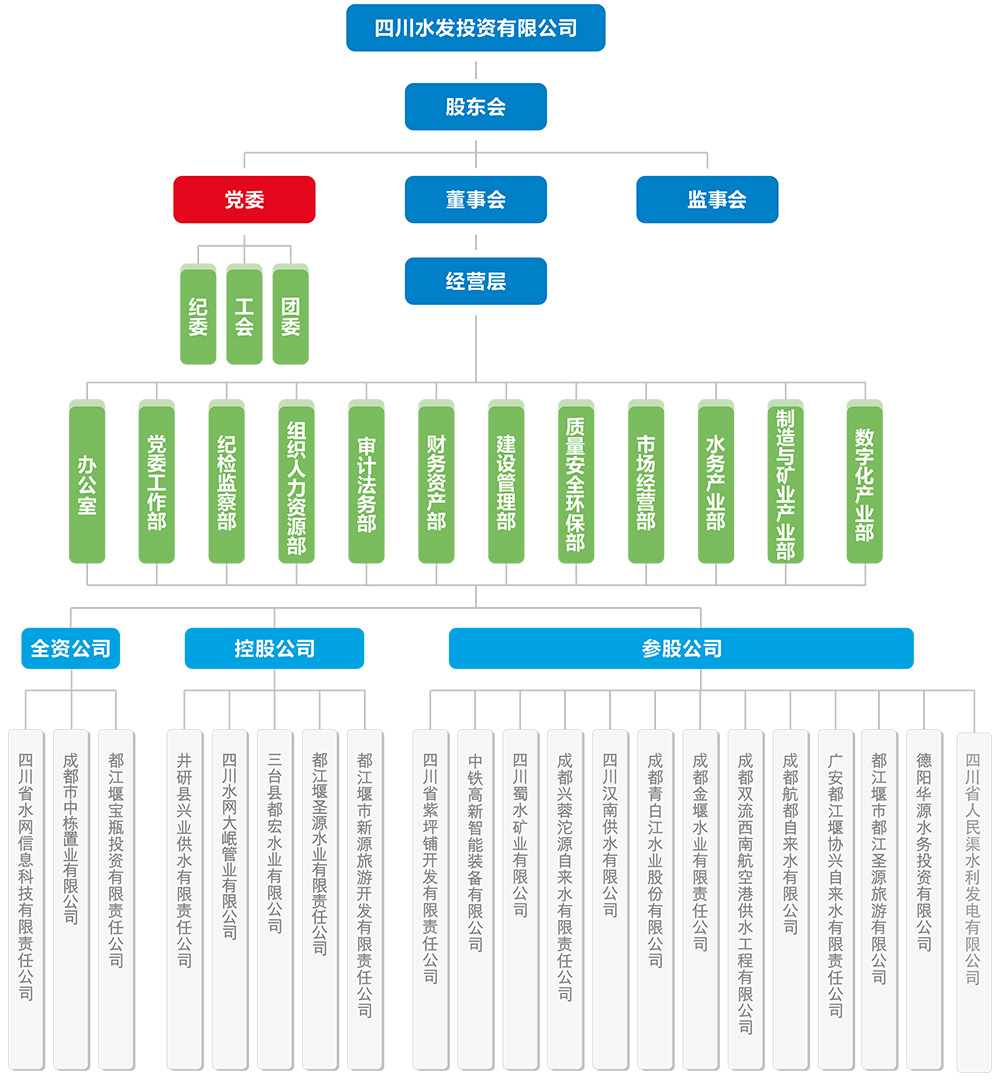 公司本部設有辦公室、黨委工作部、紀檢監察部、組織人力資源部、審計法務部、財務資產部、建設管理部、質量安全環保部、市場經營部、水務產業部、制造與礦業產業部、數字化產業部等12個職能部門。現對外投資企業21家,其中全資子公司3家,控股子公司5家,參股企業13家,公司本部及下屬全資(控股)企業在崗職工304人。